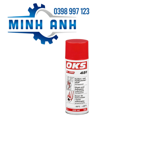 Chất bôi trơn OKS 451 là một loại dầu bôi trơn xích và bám dính tổng hợp, trong suốt, ở dạng bình xịt, được sử dụng để bôi trơn các chi tiết máy và xích chịu tải trọng cao, hoạt động trong môi trường trong nhà hoặc ngoài trời. Sản phẩm này có khả năng bám dính cao, chống văng, chịu tải nặng và bảo vệ khỏi ăn mòn.